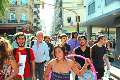 Esta mañana, unos 200 artistas de la Sala Alberdi realizaron una vistosa marcha desde su acampe en el Centro Cultural San Martín hasta la Fiscalía sudeste, en Bartolomé Mitre al 1700, y presentaron allí un escrito para evitar el desalojo. Junto a Alejandra Darín, titular de la Asociación Argentina de Actores, acompañó la movida el actor Héctor «Cacho» Bidonde, ex legislador porteño y del MST. Ambos intervinieron para que los representantes de los artistas fueran recibidos por la Fiscalía.