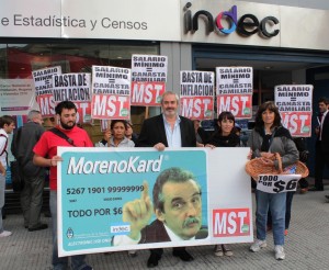 Ante el INDEC, antes de participar en la marcha de la CTA y la CGT, hoy Vilma Ripoll y el diputado Alejandro Bodart (MST en Proyecto Sur) entregaron una tarjeta “MorenoKard” gigante y una canasta con productos por valor de 6 pesos, destinadas al Secretario de Comercio.